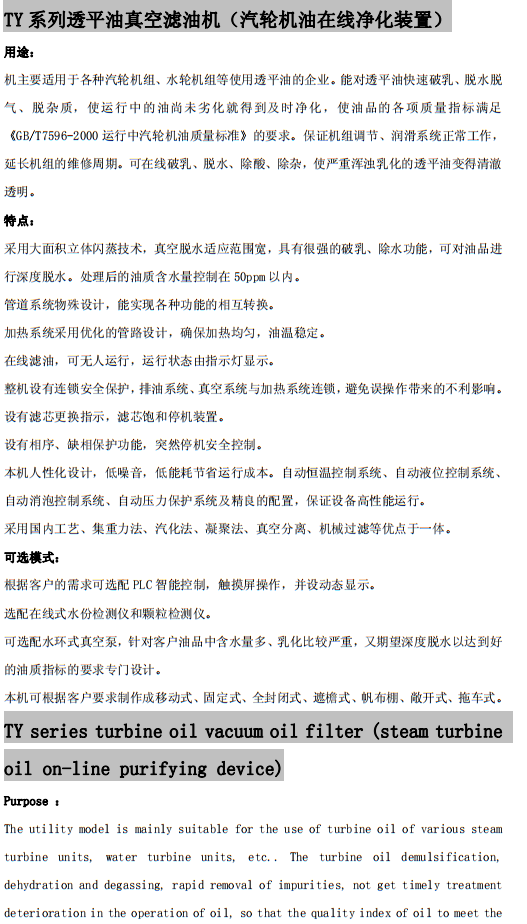 TY系列透平油真空濾油機(jī)(汽輪機(jī)油在線凈化裝置)